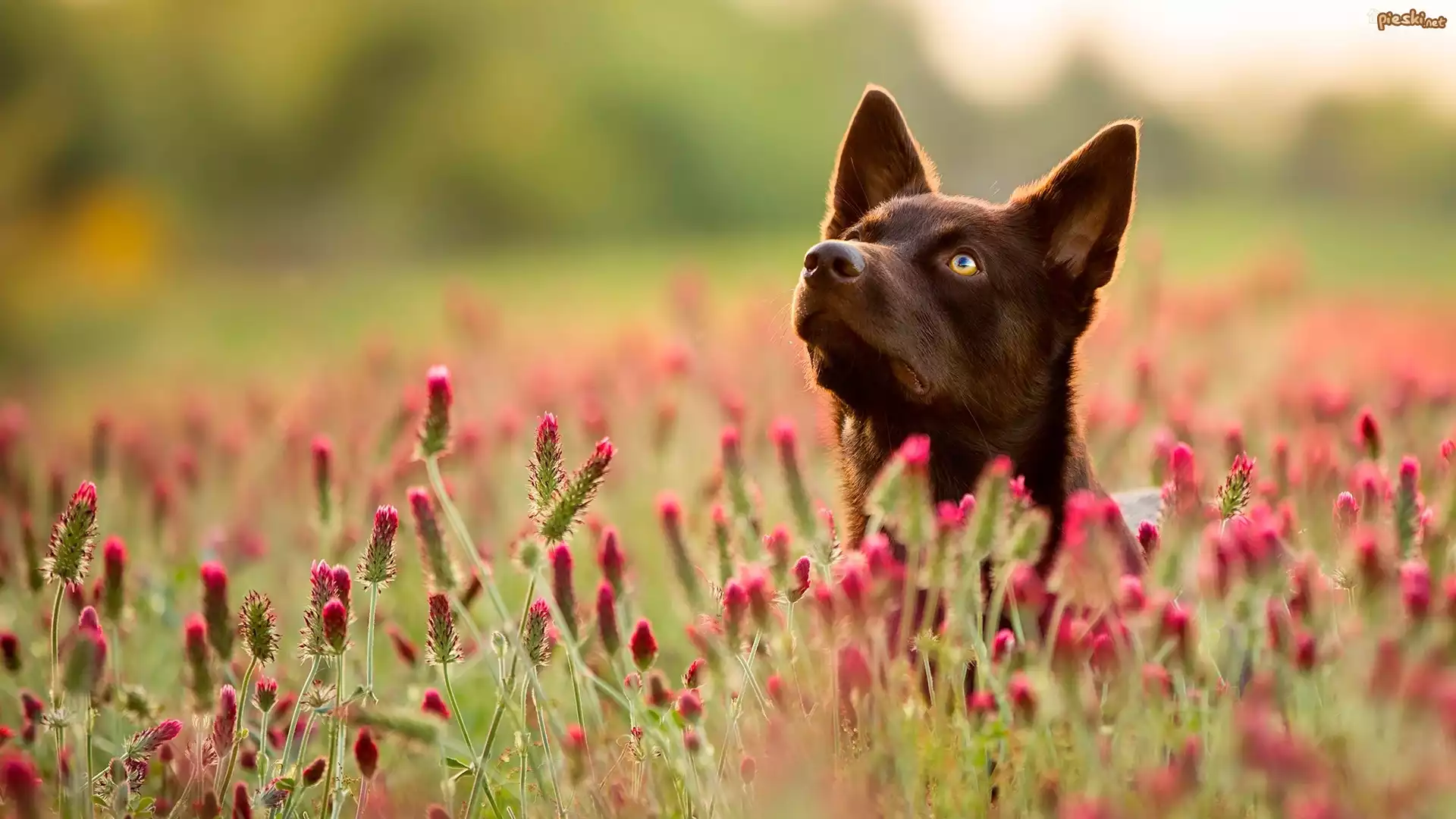 Pies Pies, Mordka, Owczarek australijski kelpie, Łąka, Kwiaty