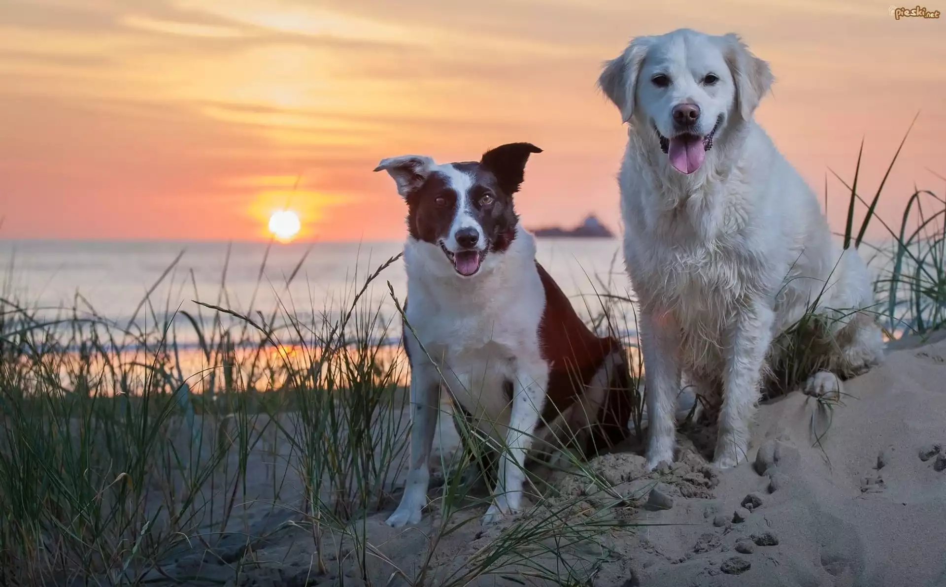 Pies Morze, Zachód, Słońca, Dwa, Psy
