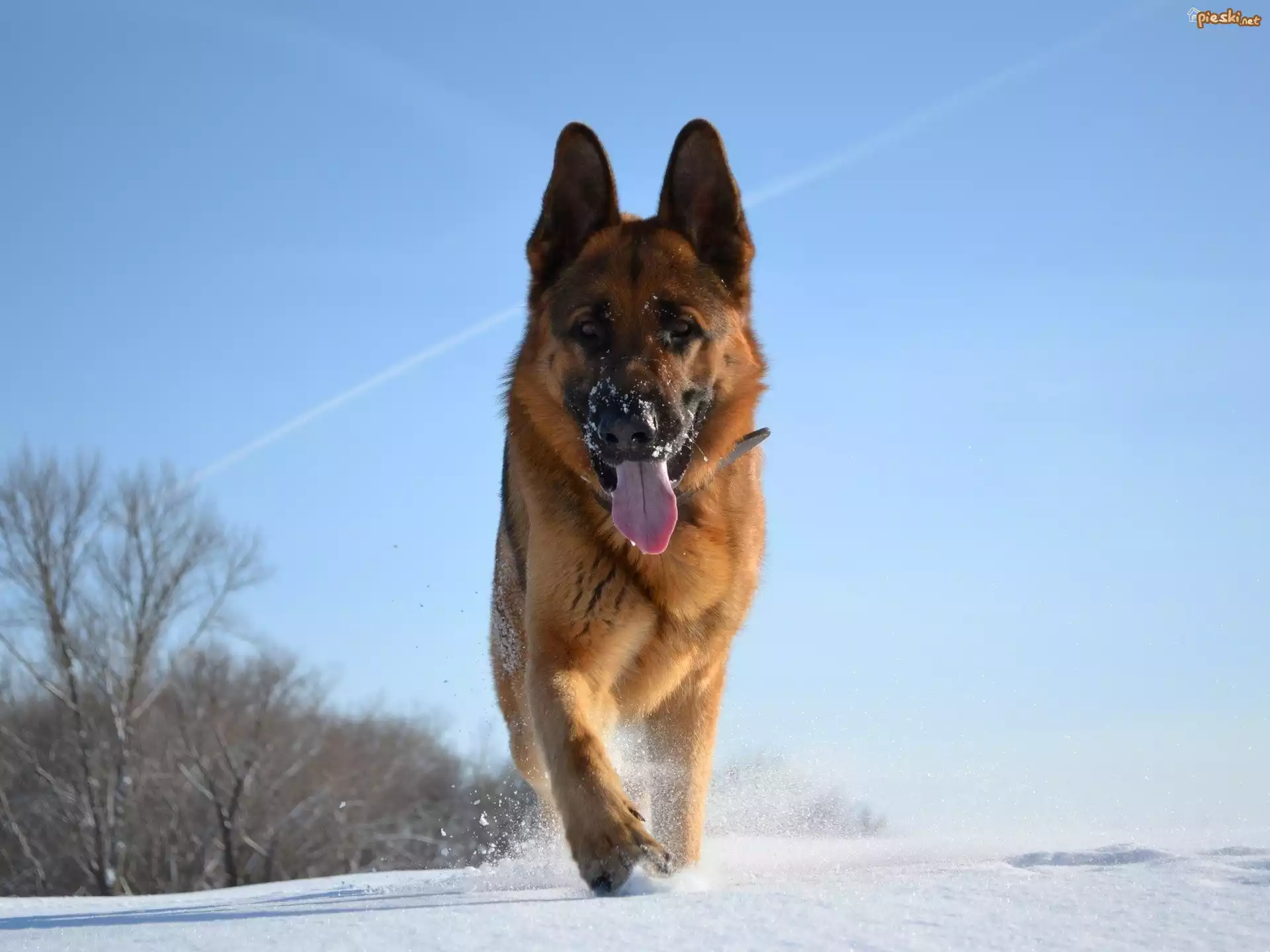 Pies Owczarek, Niemiecki, Język, Spacer, Śnieg, Niebo, Drzewa