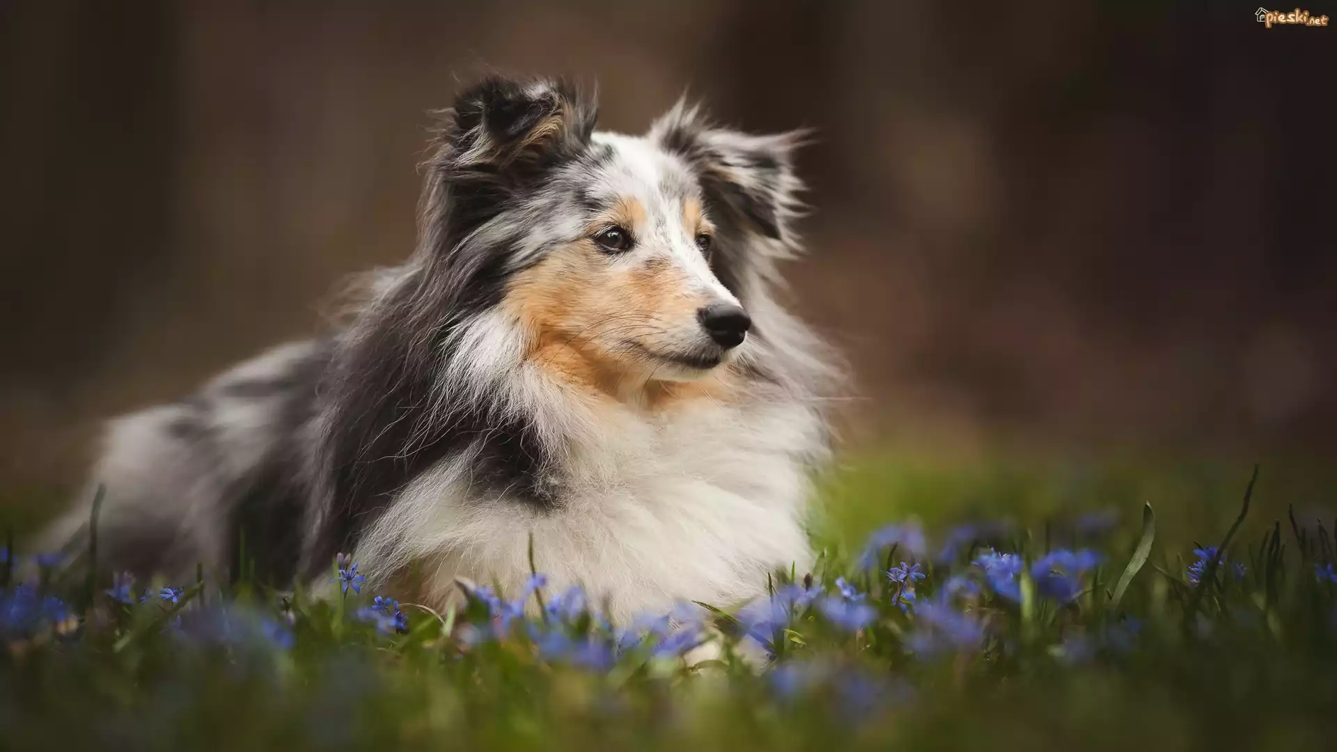 Pies Owczarek szetlandzki, Łąka, Kwiaty