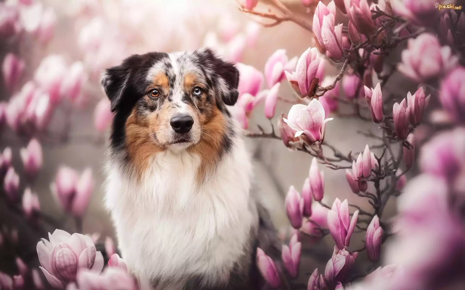 Pies Pies, Owczarek australijski, Kwiaty, Magnolia