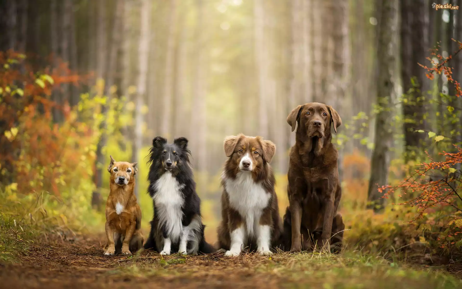 Pies Psy, Kundelek, Owczarek szetlandzki, Owczarek australijski, Labrador retriever, Las, Polanka, Krzewy |