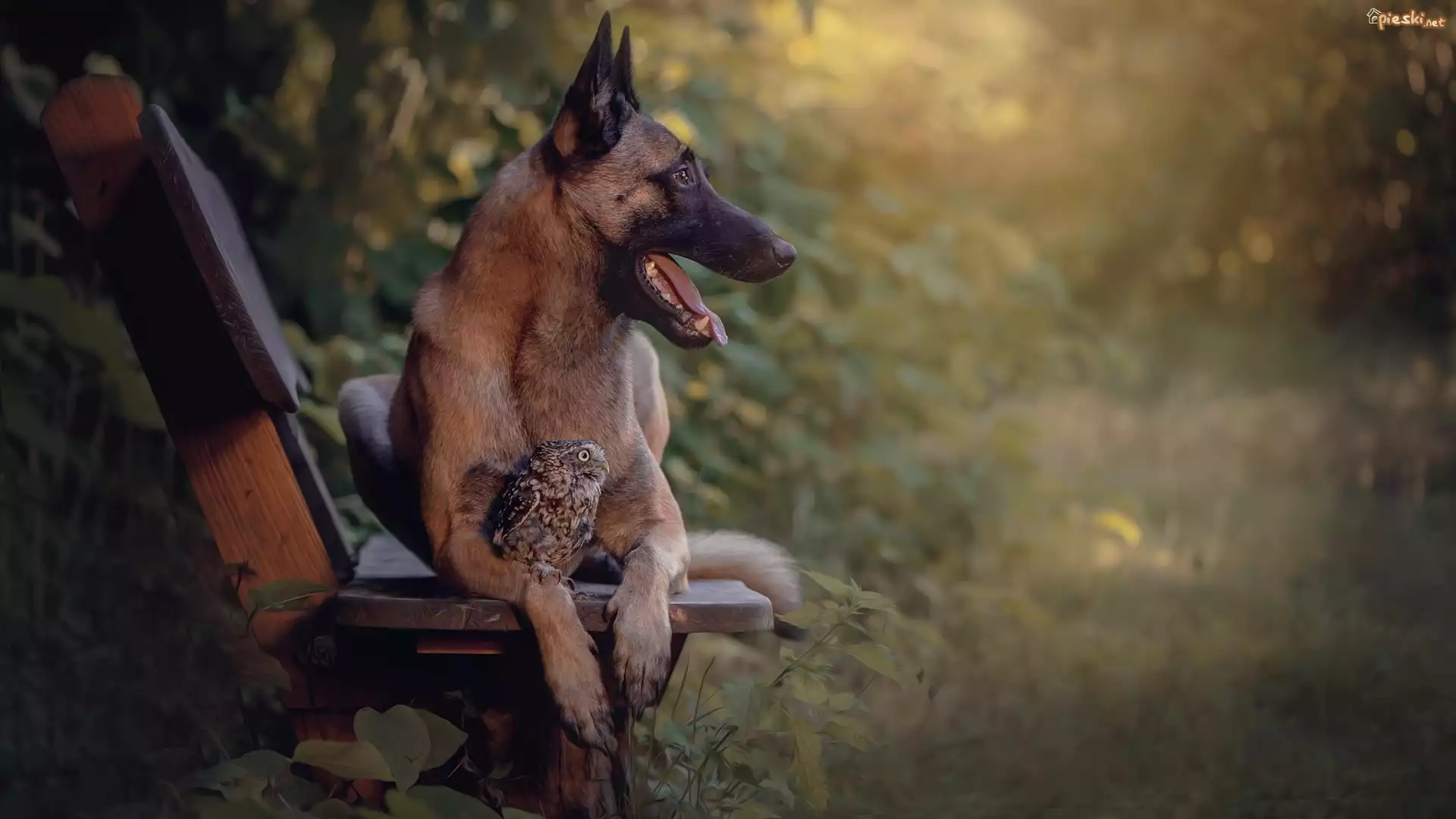 Pies Pies, Owczarek belgijski malinois, Sowa, Pójdźka, Ławka, Rośliny