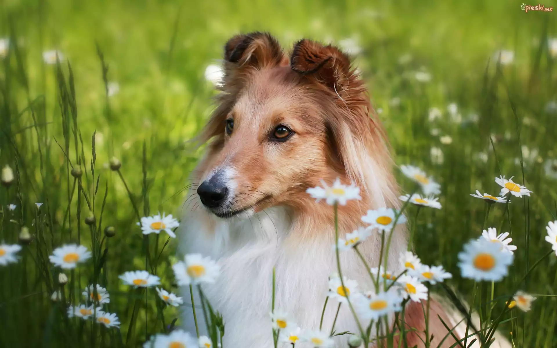 Pies Pies, Owczarek szetlandzki, Łąka, Kwiaty