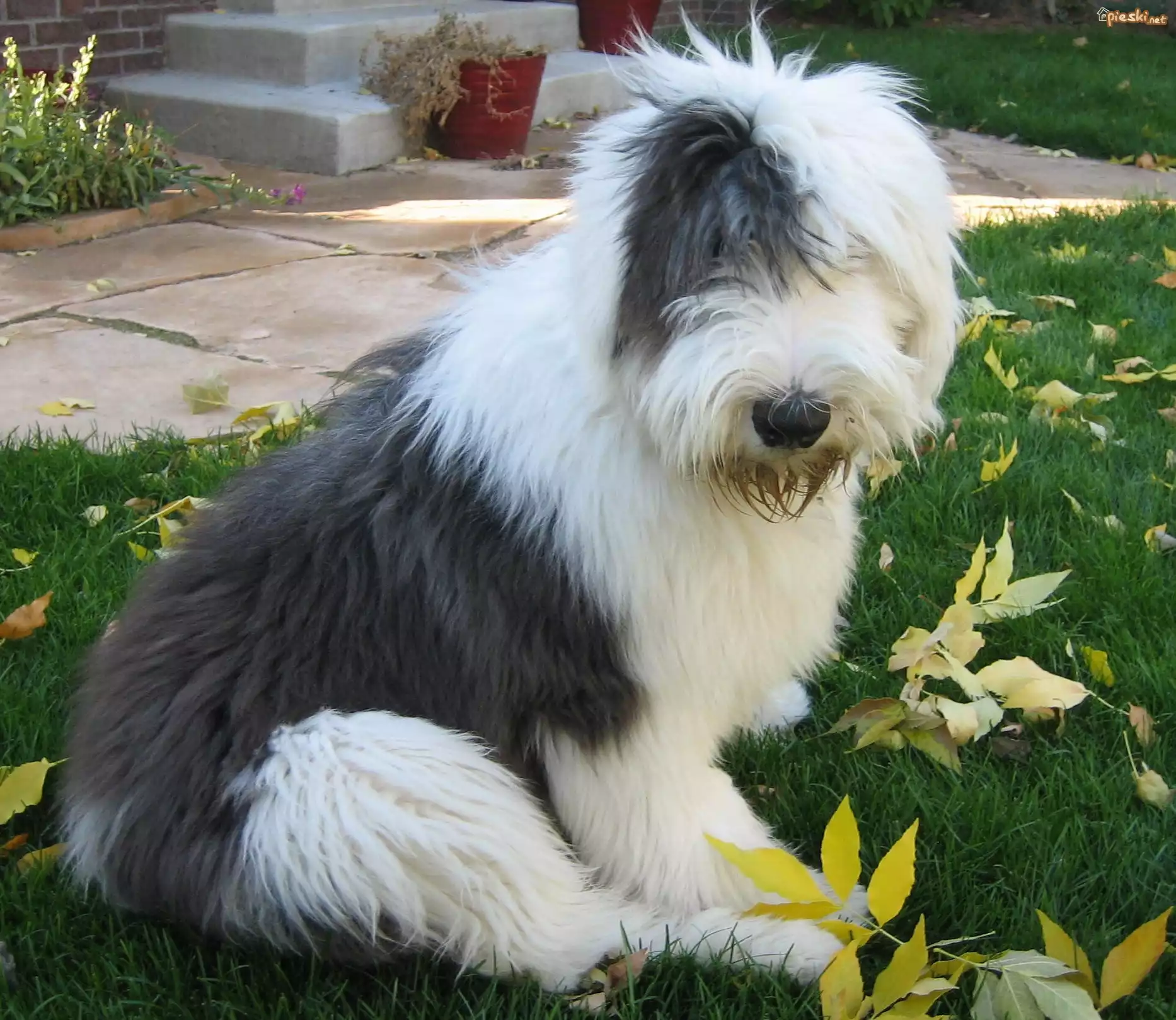 Owczarek staroangielski Bobtail, trawa, liście