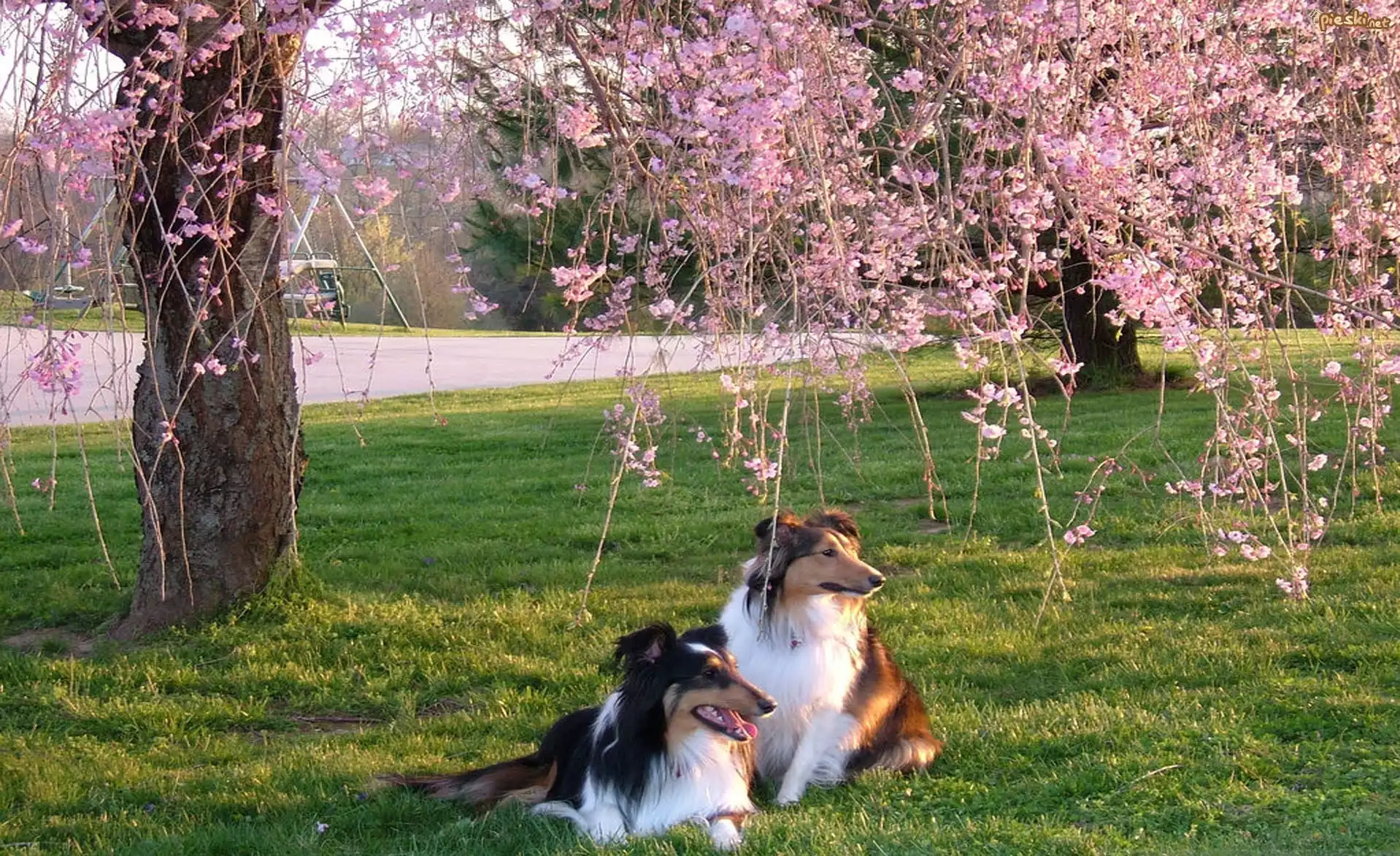 Pies Owczarki, Łąka, Kwitnące, Drzewa, Wiosna