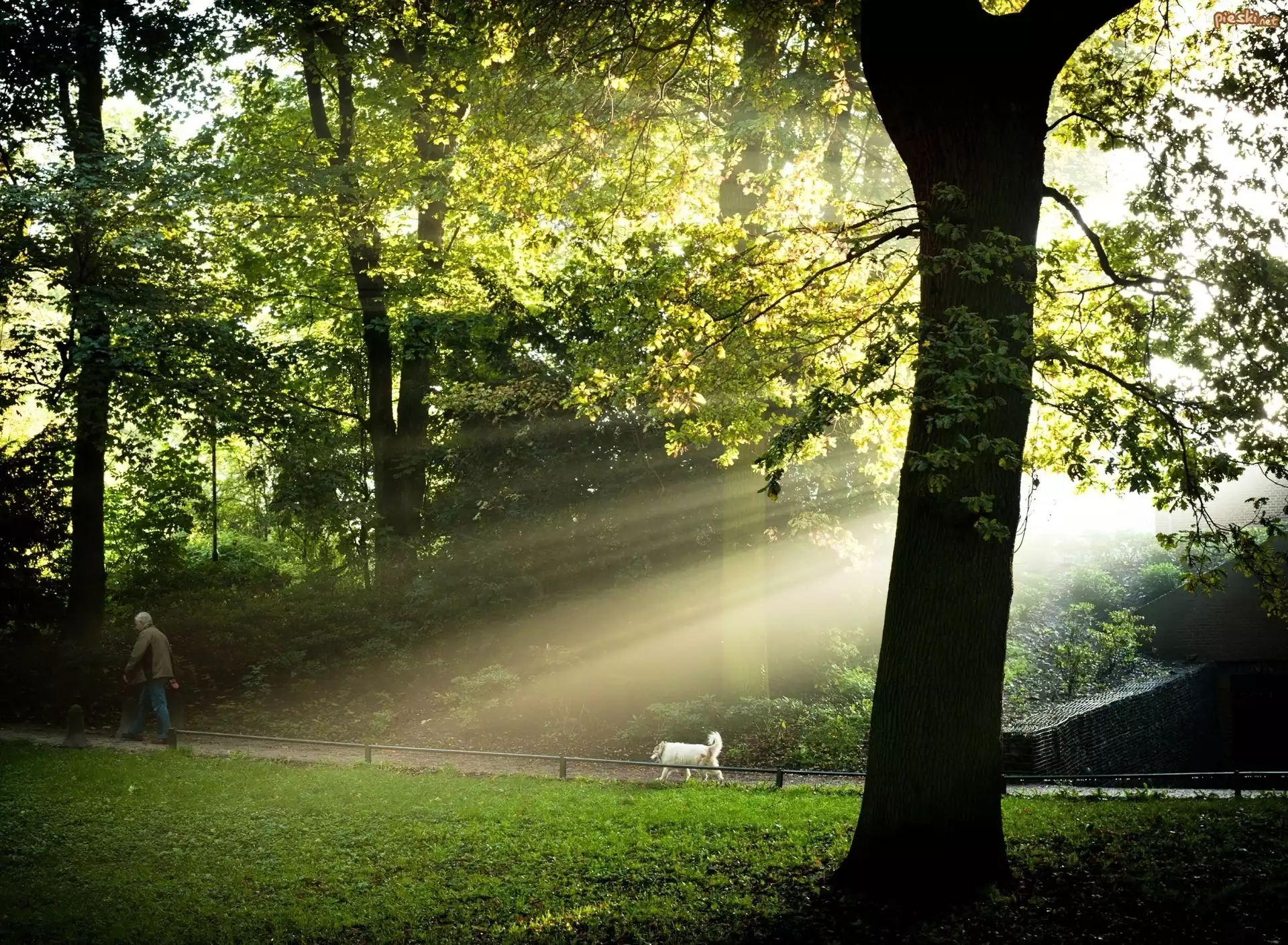 Park, Człowiek, Spacer, Pies, Promienie Słońca