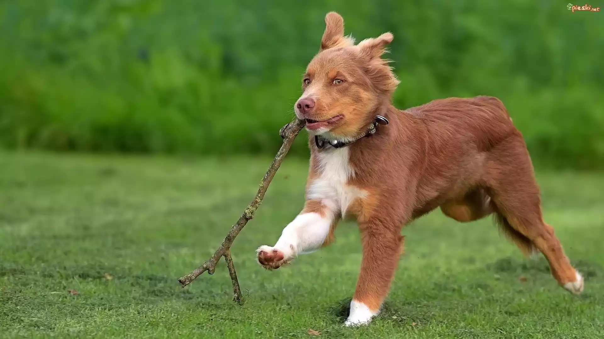 Pies Pies, Owczarek australijski, Patyk, Trawa, Szczeniak
