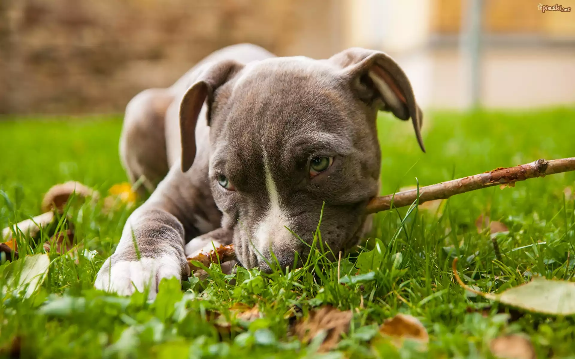 Pies Pies, Szczeniak, Amerykański staffordshire terier, Amstaff, Trawa, Liście, Łąka, Patyk