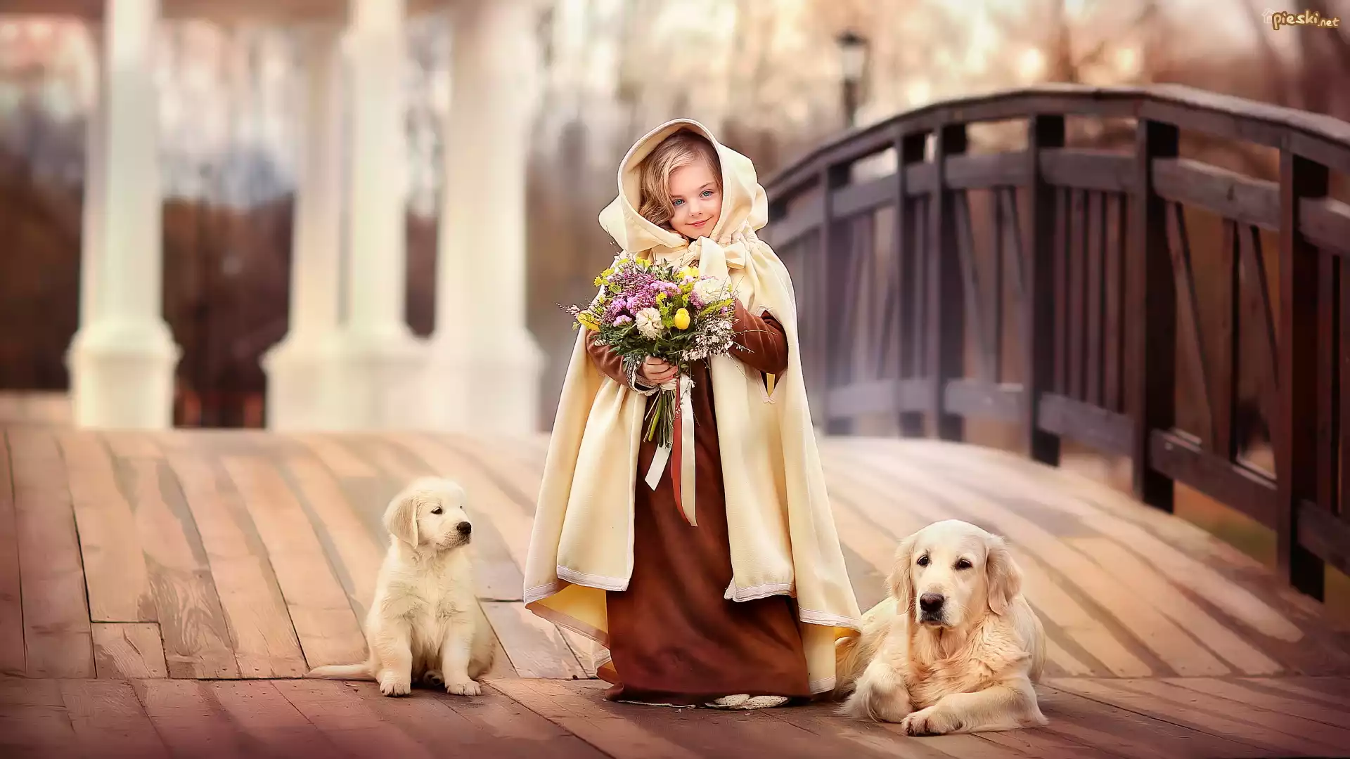Dziewczynka, Peleryna, Kwiaty, Psy, Golden retriever, Szczeniak, Most