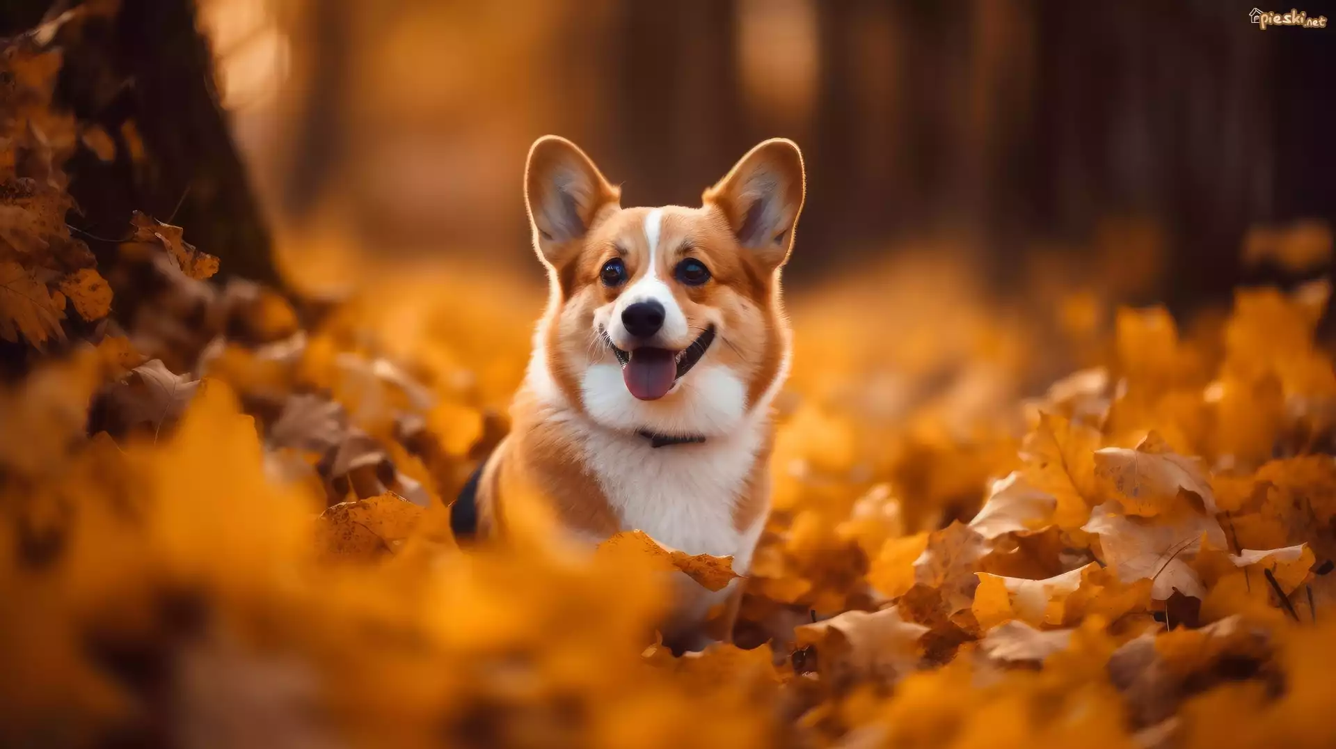 Pies Pies, Welsh corgi pembroke, Liście, Jesień, Grafika