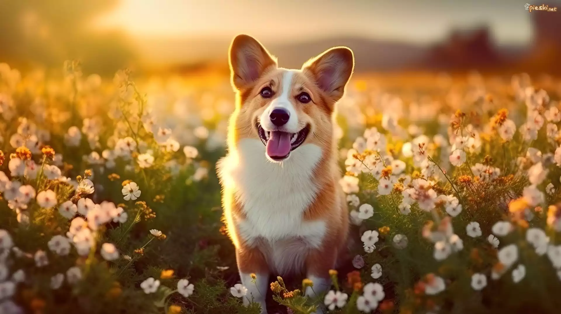 Pies Pies, Welsh corgi pembroke, Spojrzenie, Kwiaty, Łąka