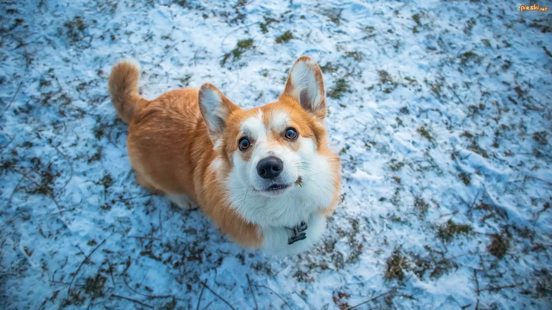 Pies Pies, Welsh corgi pembroke, Zima, Trawa, Spojrzenie