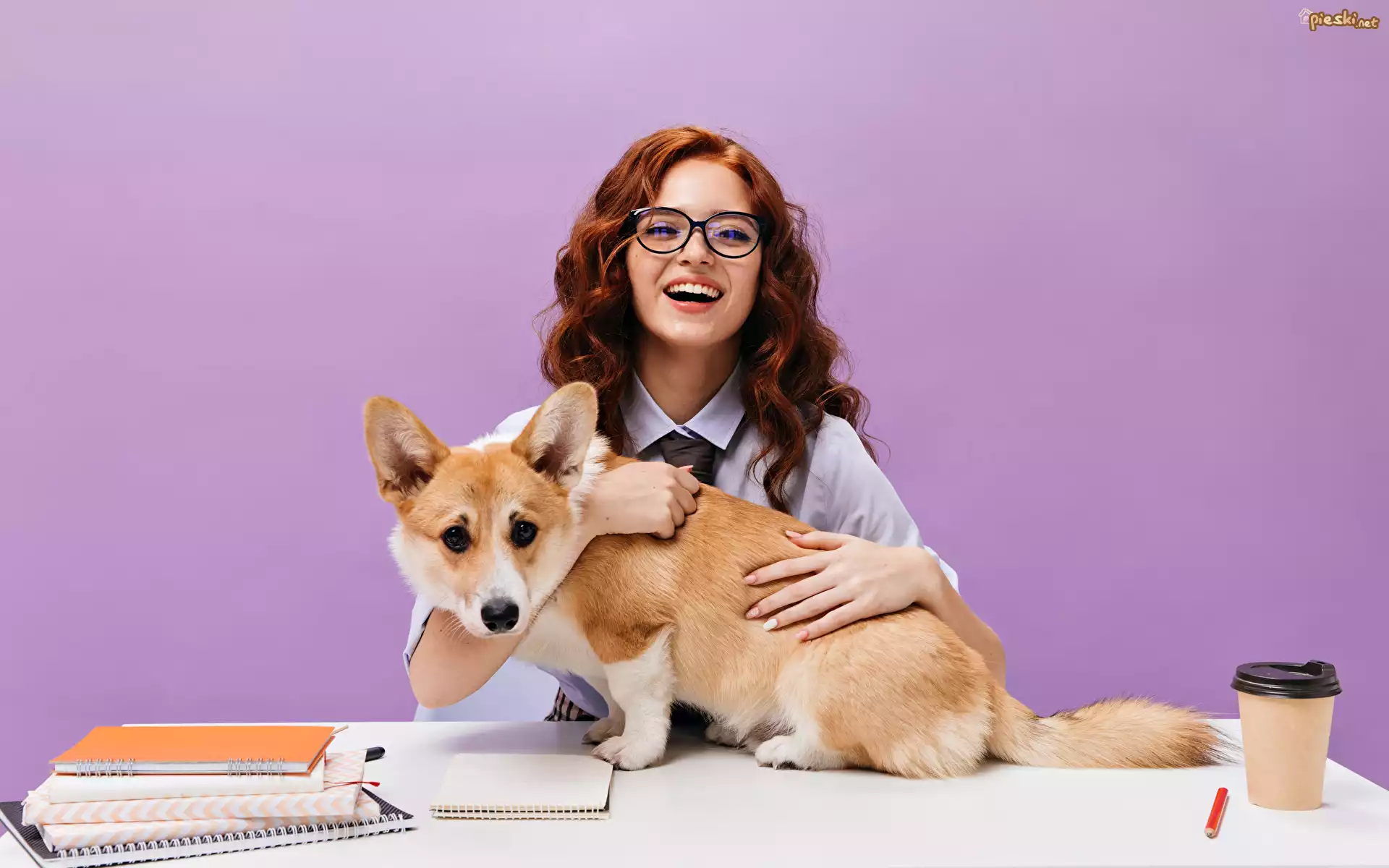 Pies Rudowłosa, Kobieta, Okulary, Pies, Welsh corgi pembroke, Stół, Zeszyty, Kubek, Ołówek
