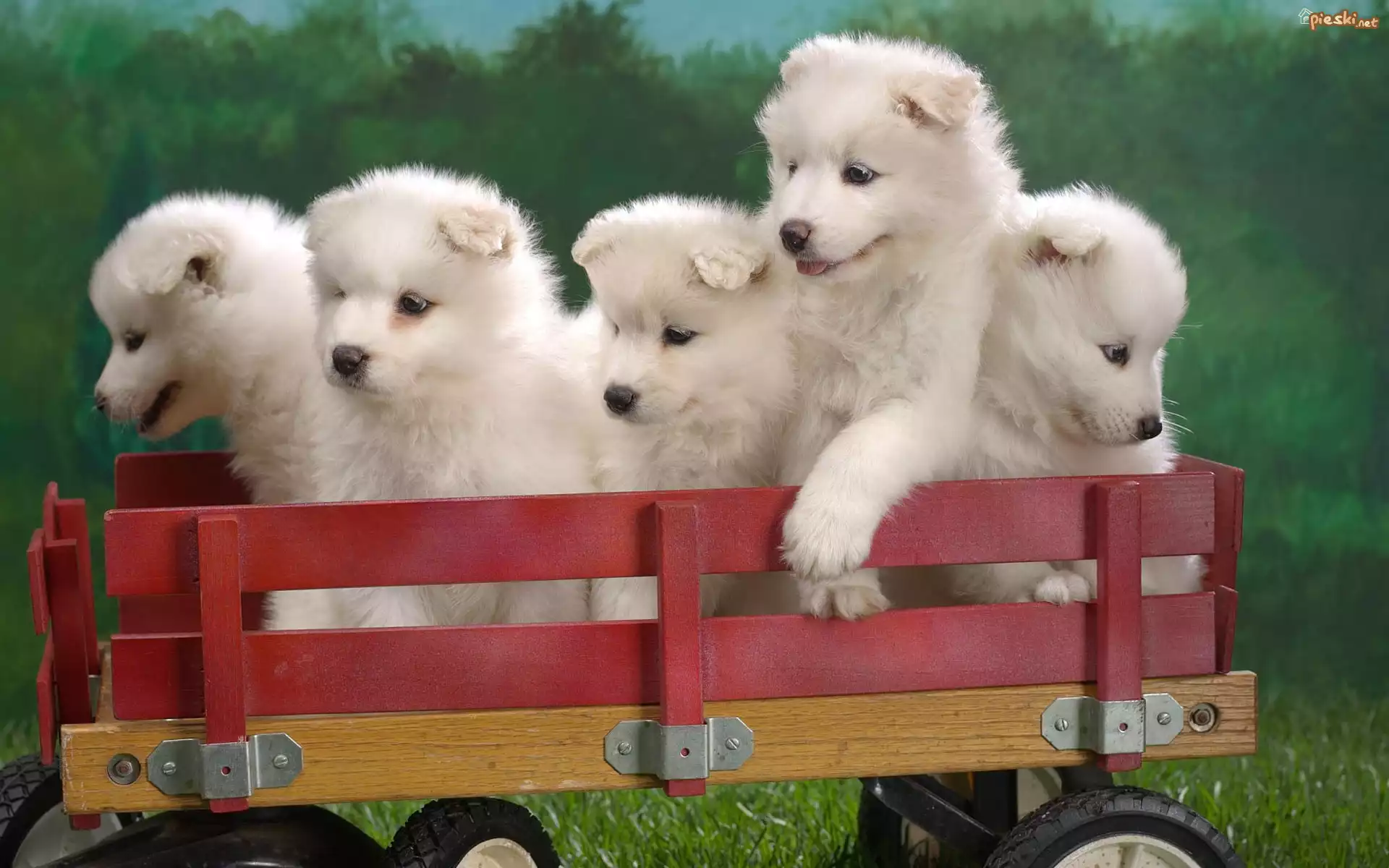 pięć, słodkich, szczeniaków, Samojed, wózek