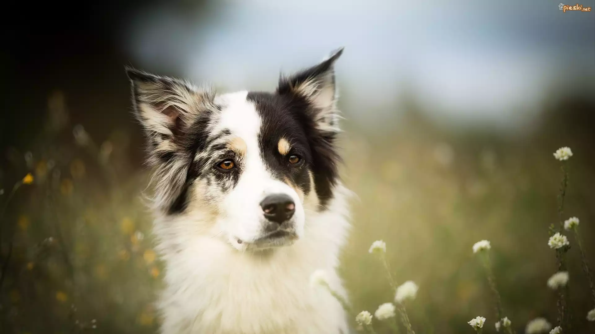 Pies, Border collie, Mordka, Łąka, Kwiaty