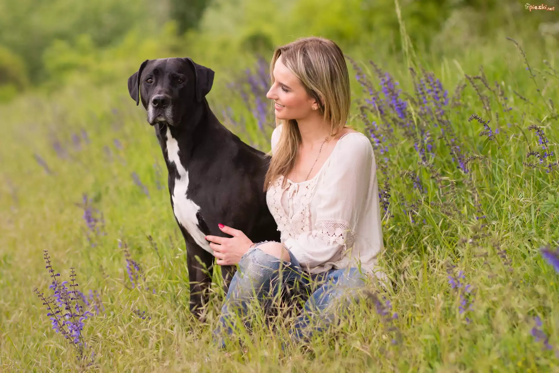 Pies Pies, Kobieta, Łąka, Kwiaty