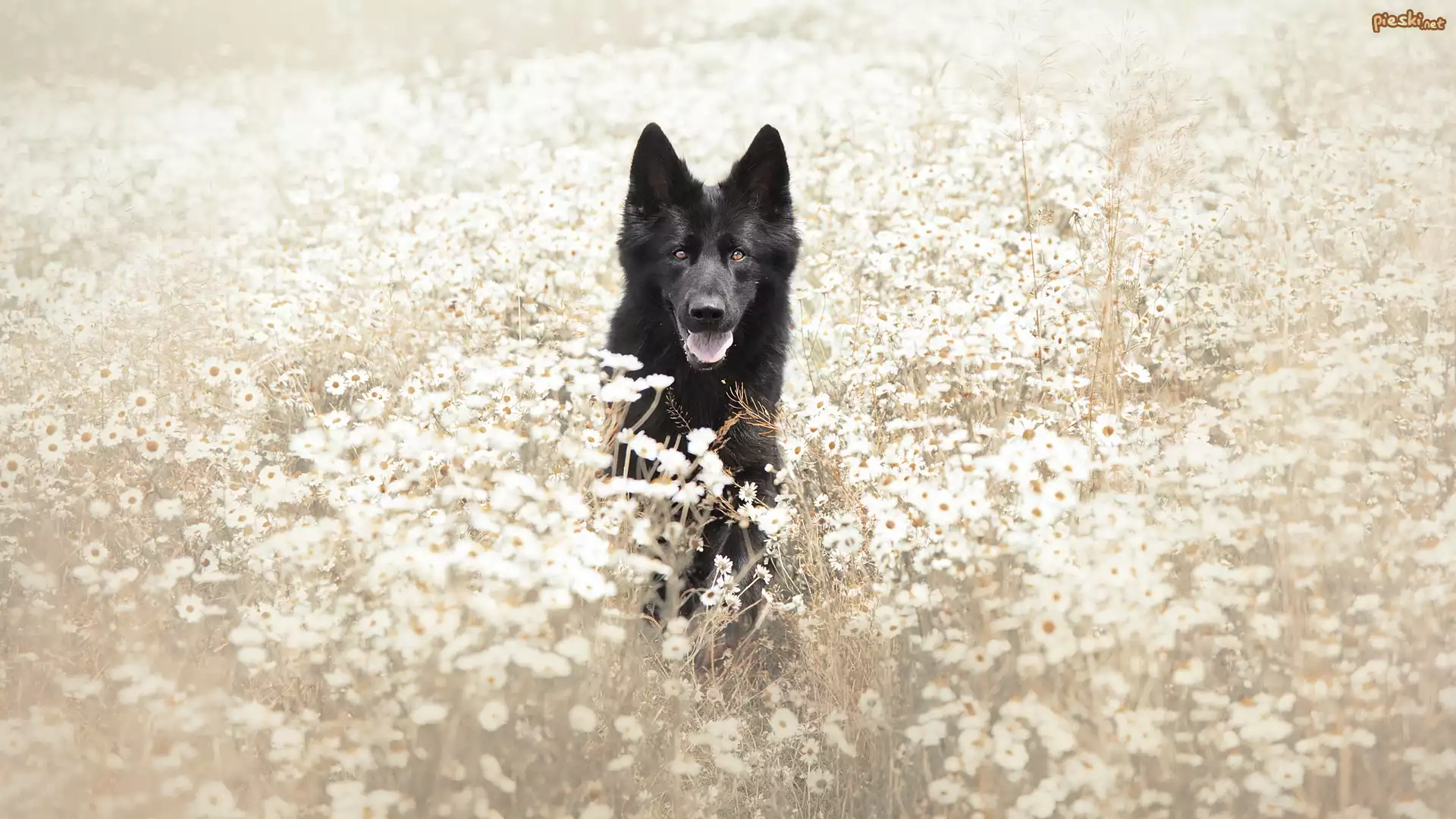 Pies Pies, Czarny owczarek niemiecki, Łąka, Kwiatki