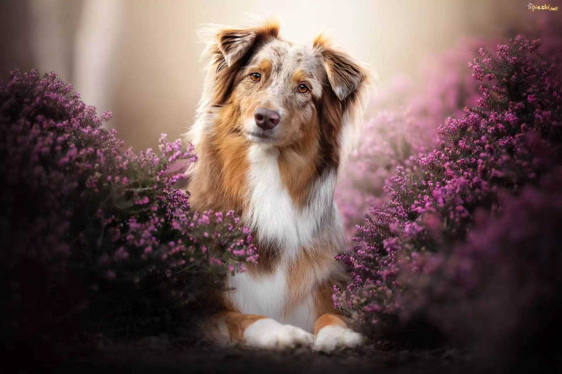 Pies Pies, Brązowo-biały, Owczarek australijski, Wrzosy