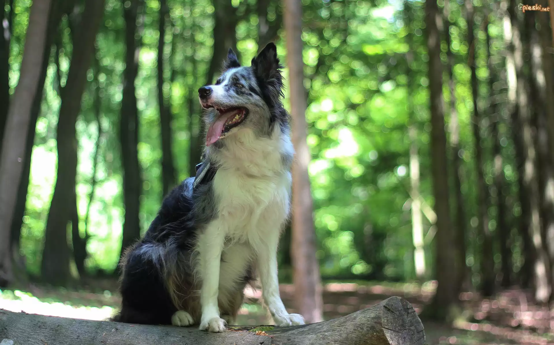 Pies Siedzący, Pies, Border collie, Kłoda, Las, Drzewa, Bokeh