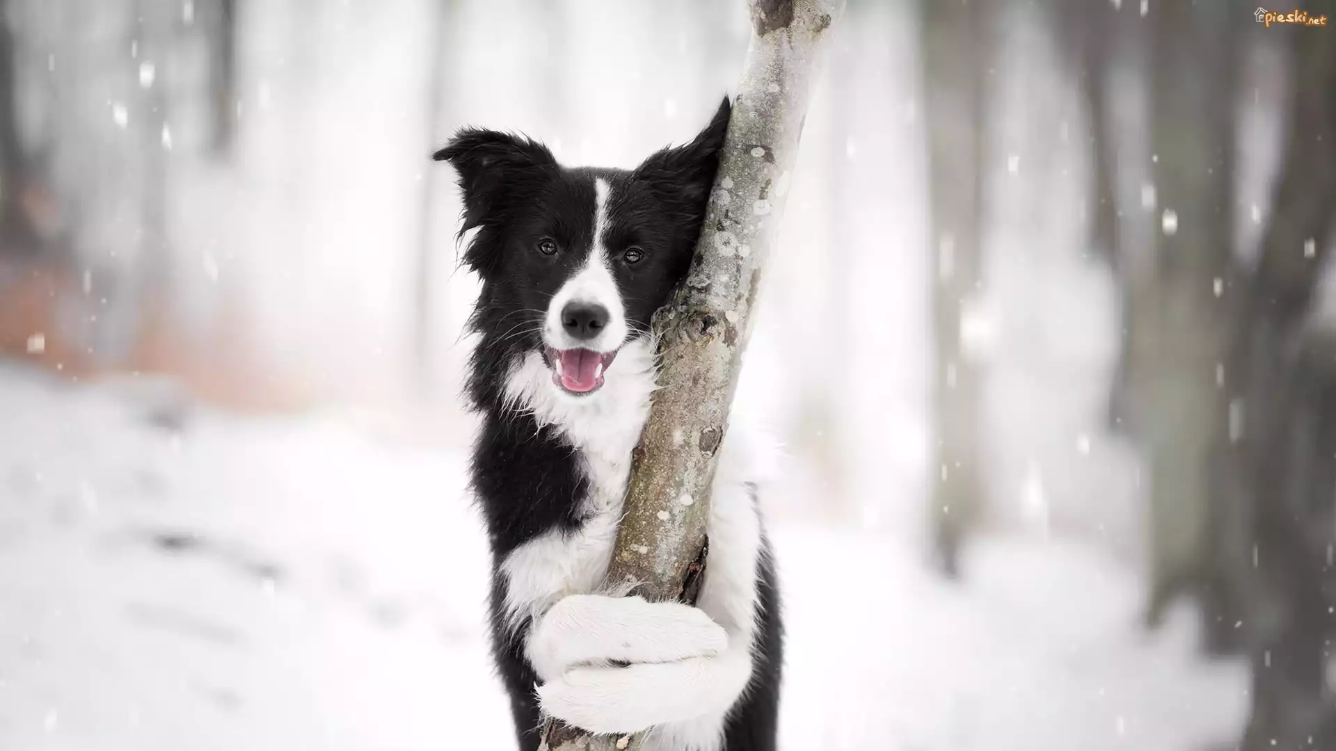 Pies Pies, Border collie, Mordka, Drzewo, Śnieg