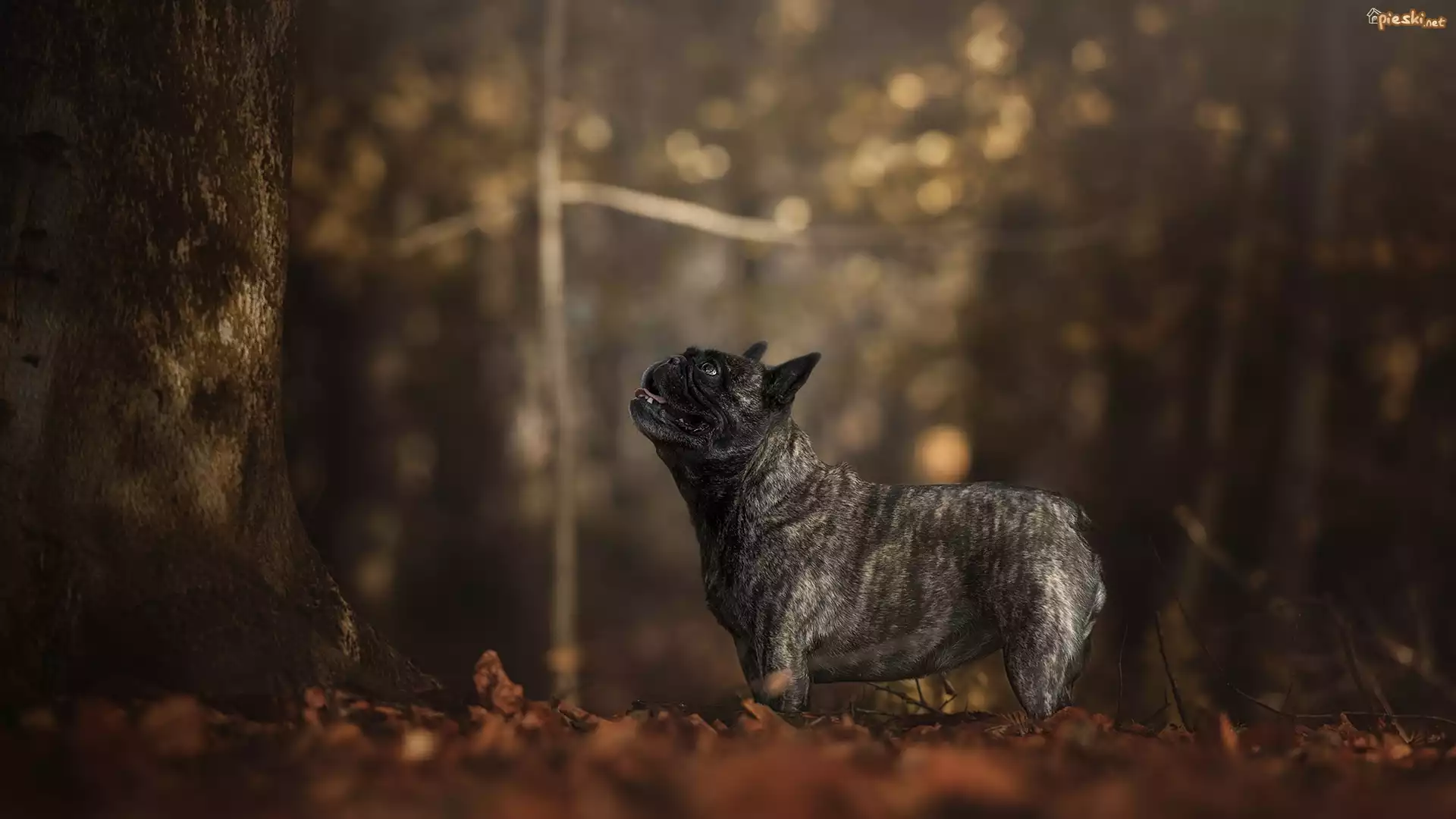 Pies Pies, Buldog francuski, Drzewo, Bokeh