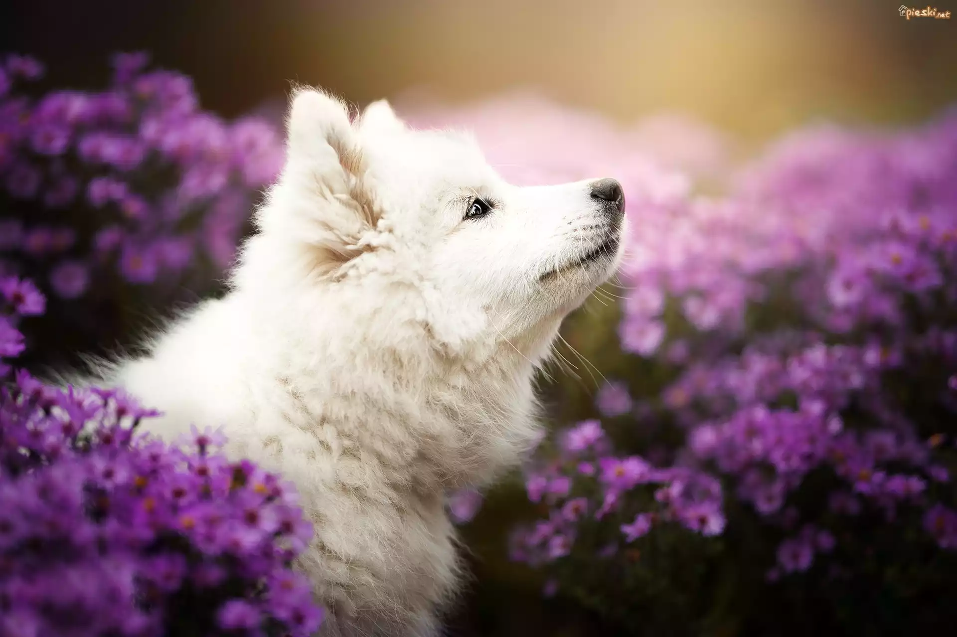 Pies, Szczeniak, Samojed, Fioletowy, Kwiat