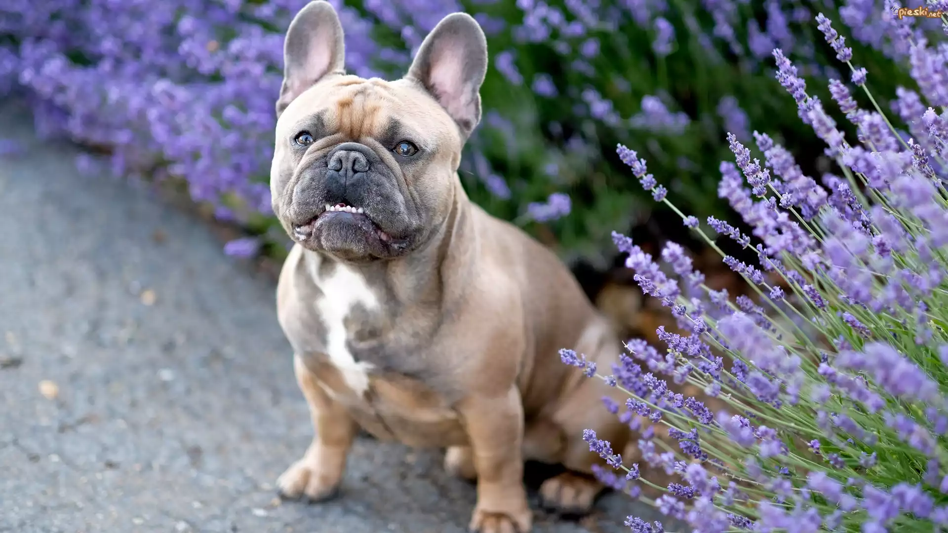 Pies Pies, Siedzacy, Buldog francuski, Lawenda