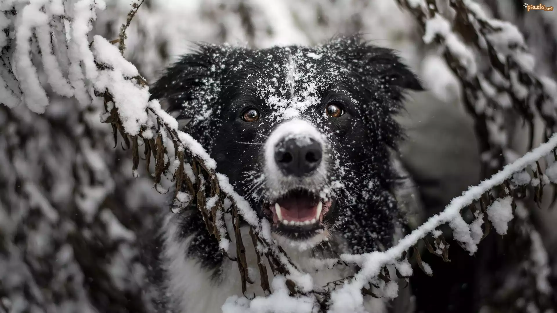 Pies Pies, Border collie, Mordka, Gałązki, Śnieg