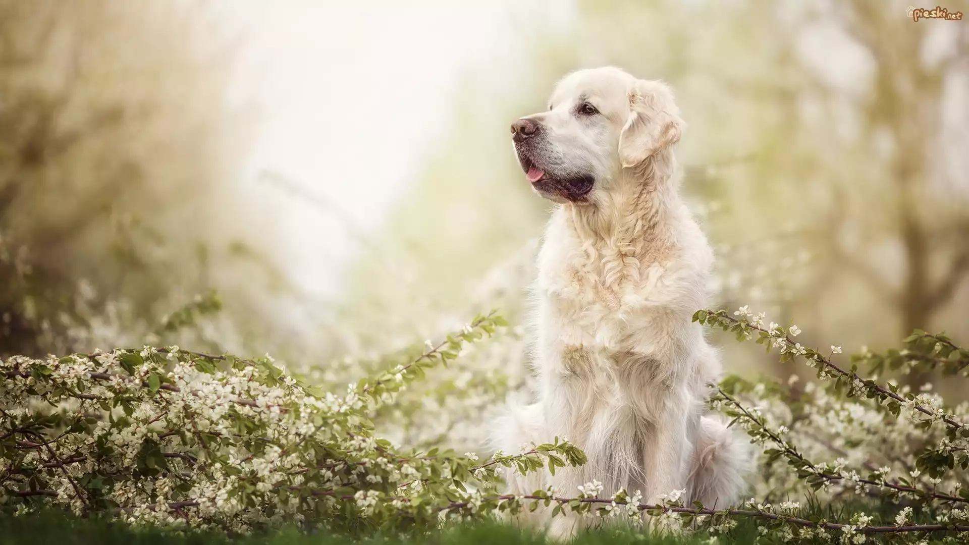 Pies Pies, Golden retriever, Gałązki, Kwiaty