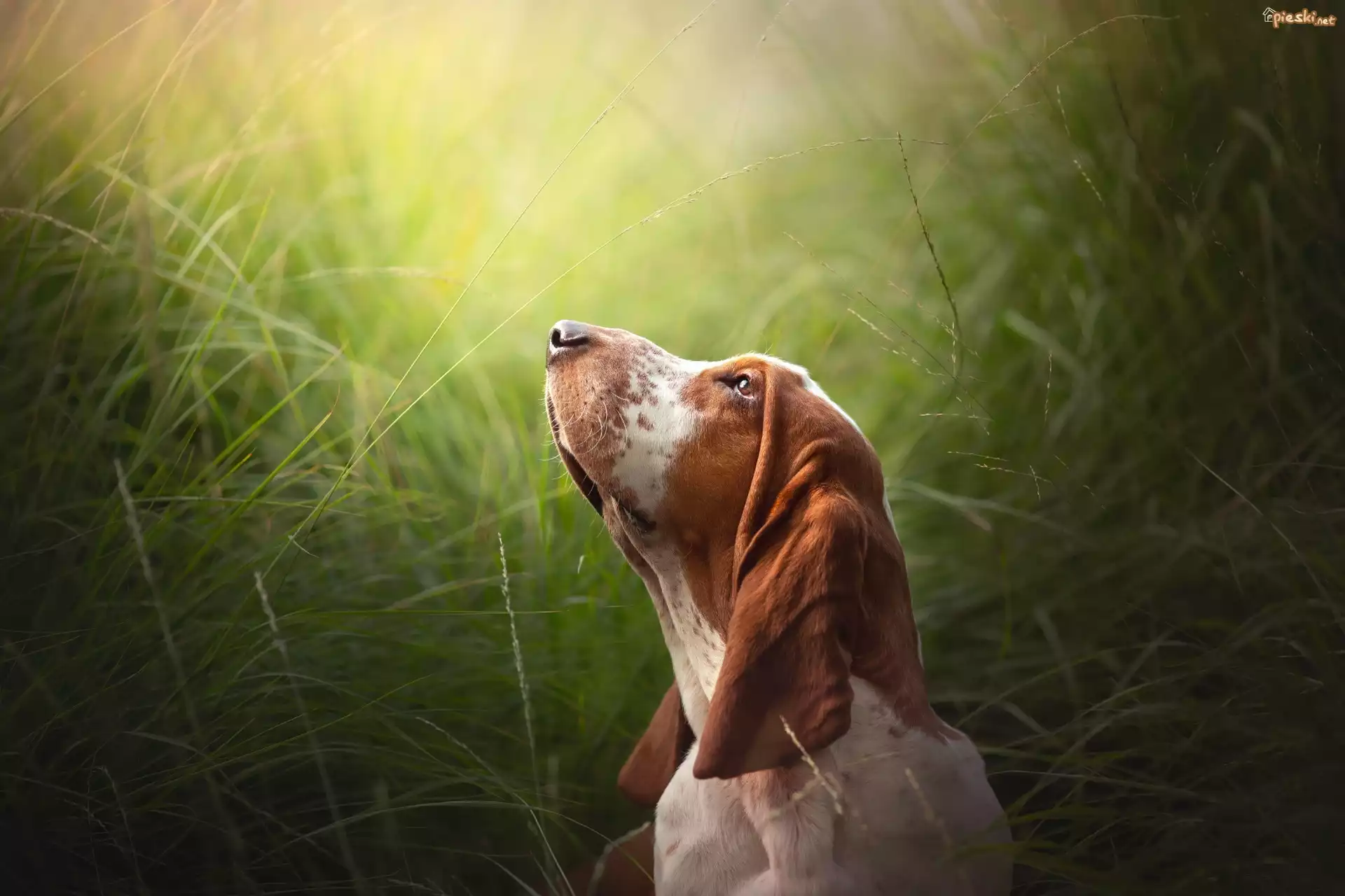 Pies Pies, Basset hound, Uniesiona, Głowa, Trawa