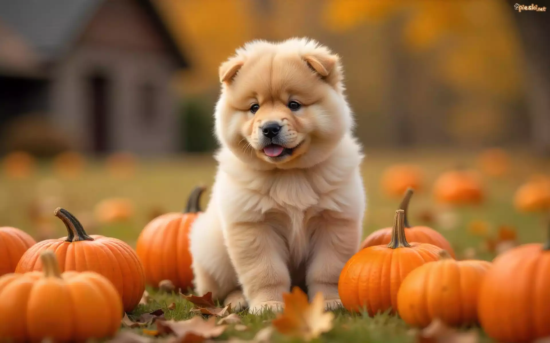 Pies Pies, Szczeniak, Chow chow, Dynie, Liście, Jesień, Grafika AI