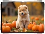 Pies, Szczeniak, Chow chow, Dynie, Liście, Jesień, Grafika AI