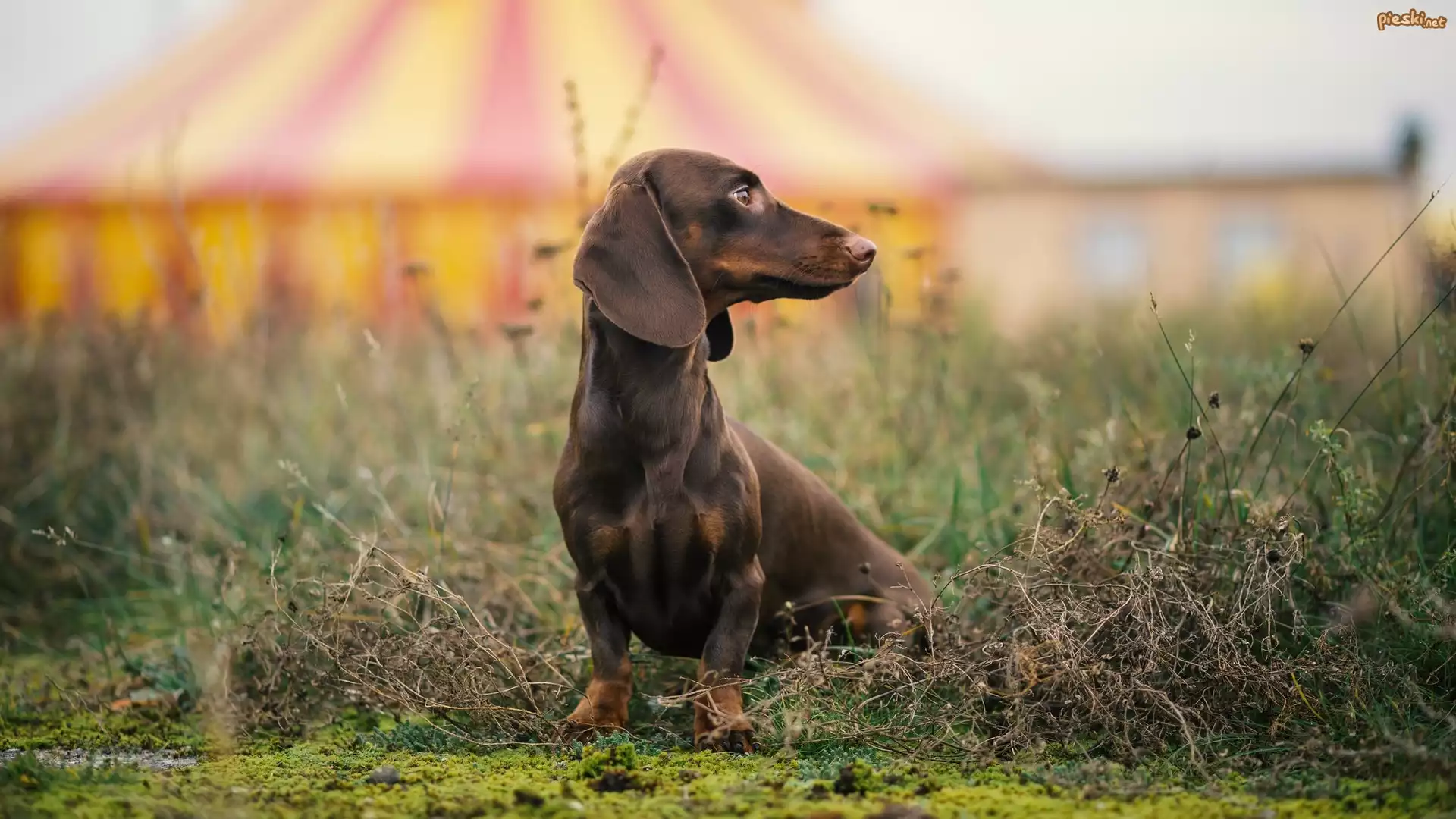 Pies Pies, Brązowy, Jamnik krótkowłosy, Trawa