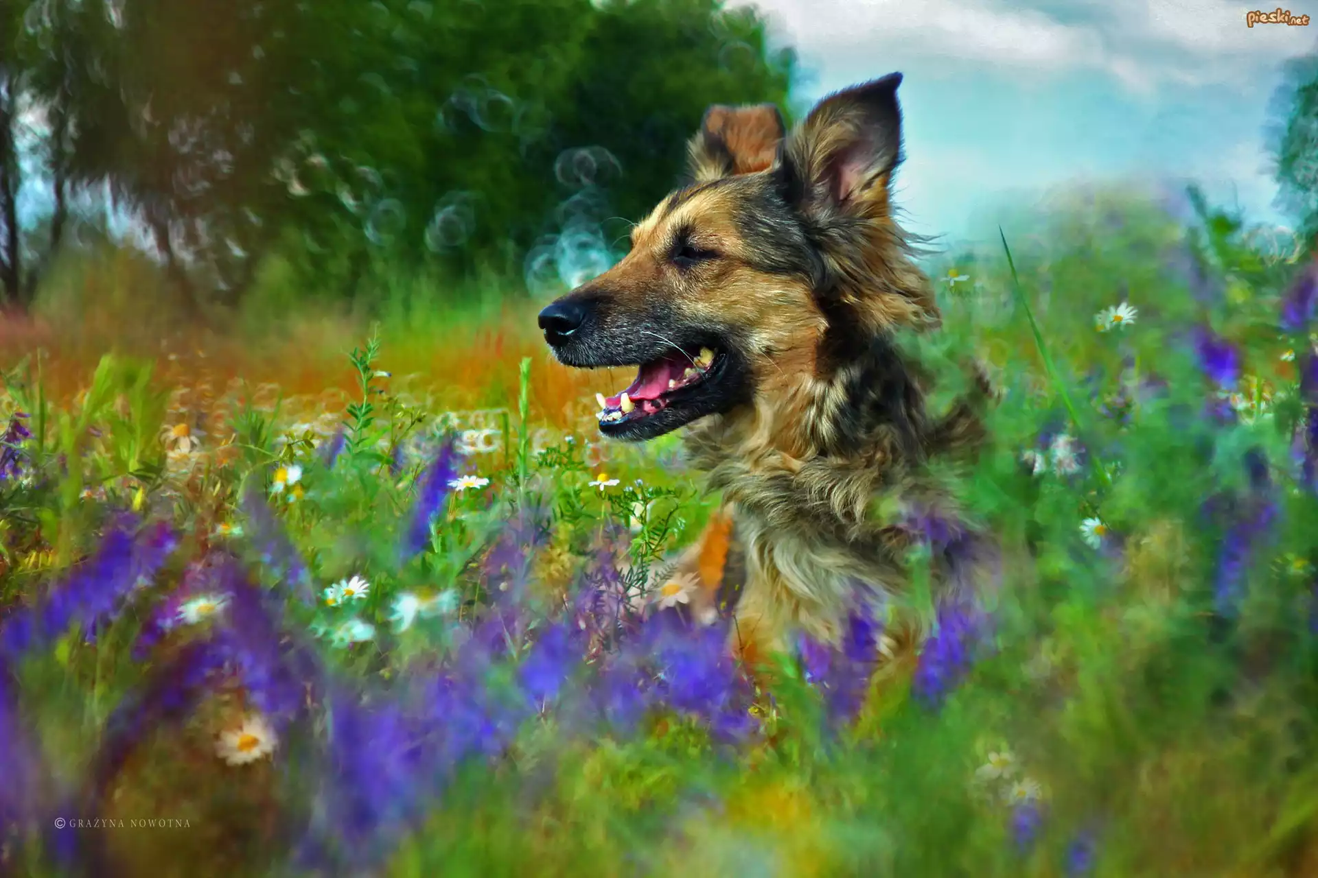 Pies Pies, Shila, Łąka, Kolorowe, Kwiaty, Kundelek