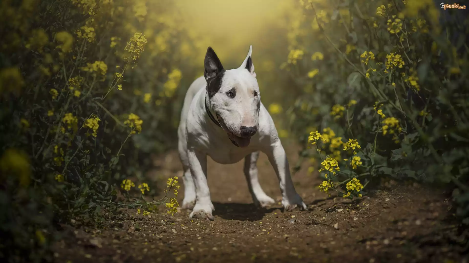 Pies Pies, Bulterier, Kwiaty, Ścieżka