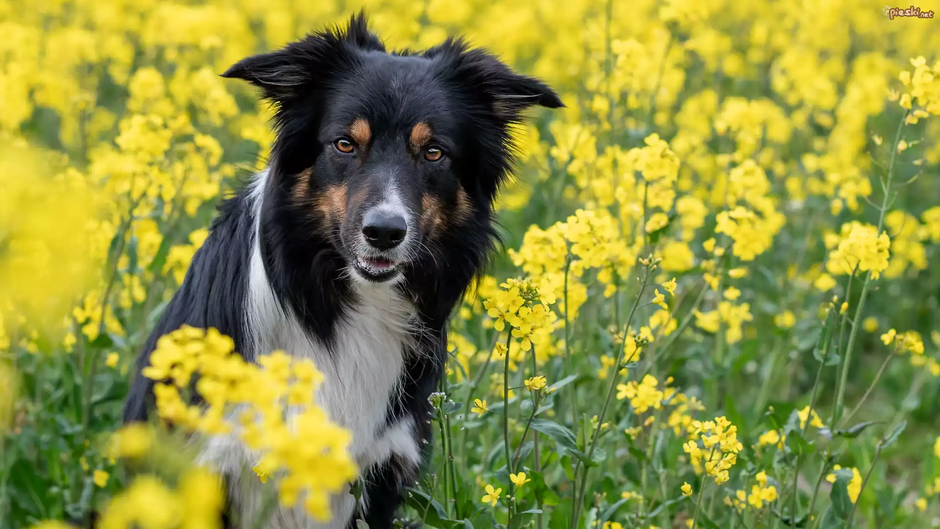 Pies, Border collie, Żółte, Kwiaty, Rzepak