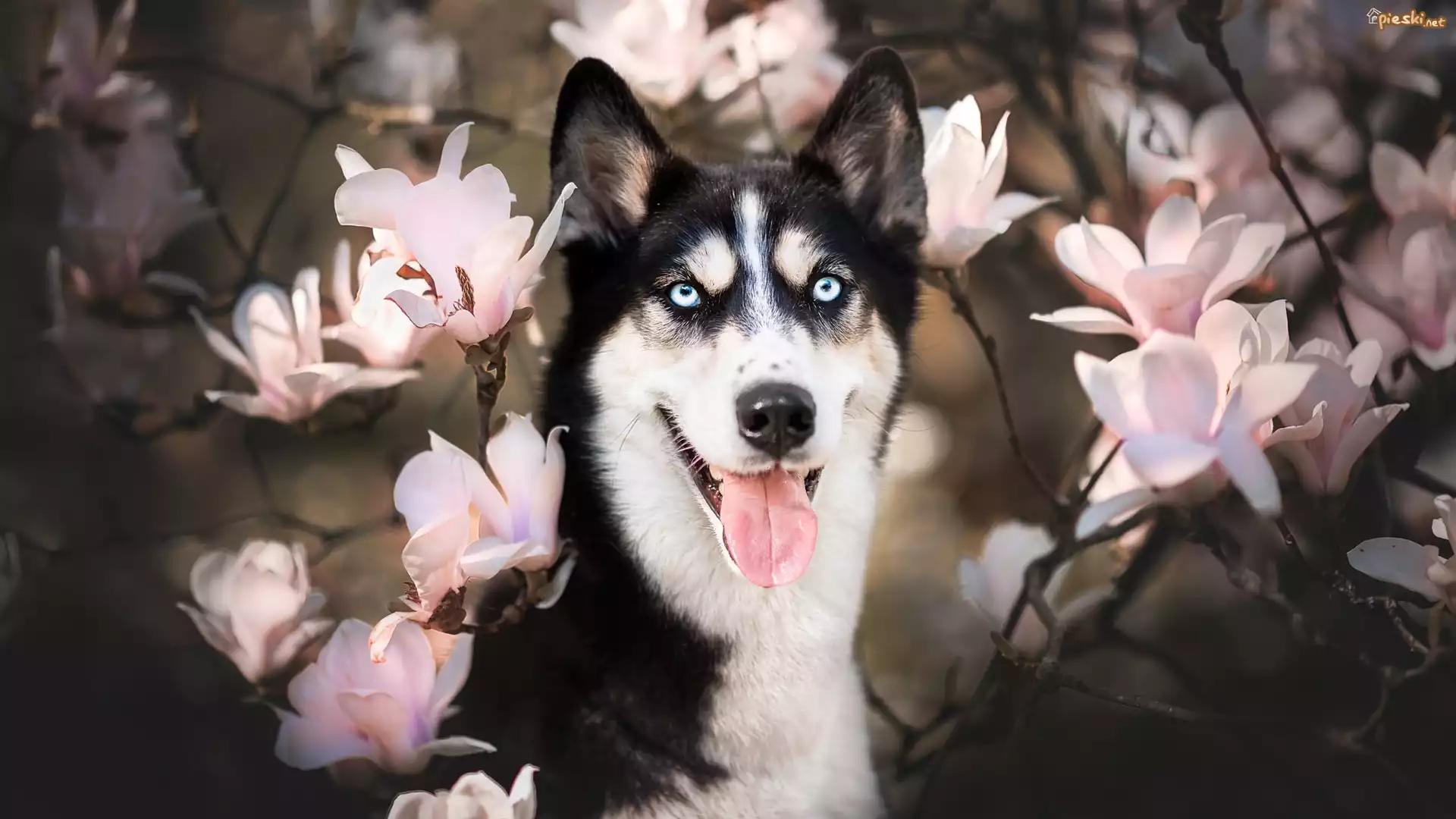 Pies Pies, Siberian husky, Mordka, Kwiaty, Magnolie