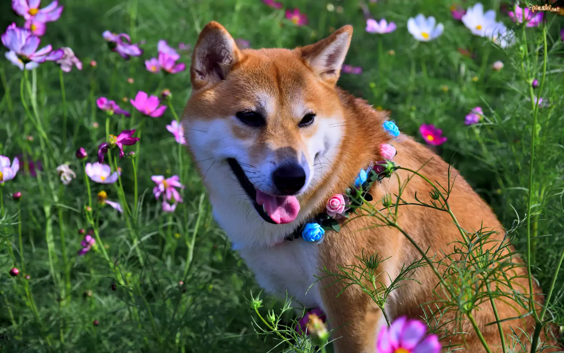 Pies Pies, Shiba inu, Obroża, Kwiaty, Kosmea