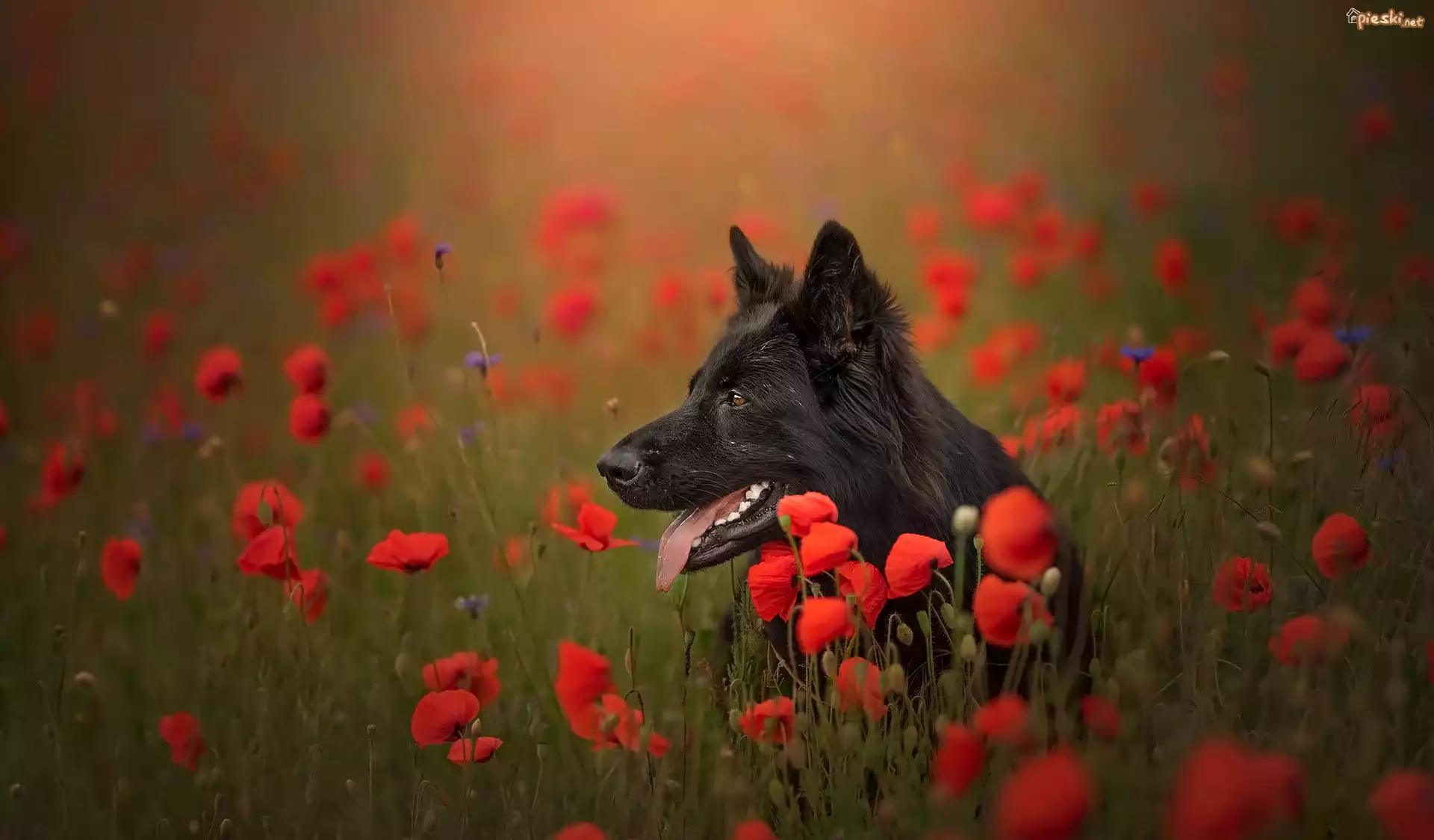 Pies Pies, Czarny owczarek niemiecki, Kwiaty, Maki