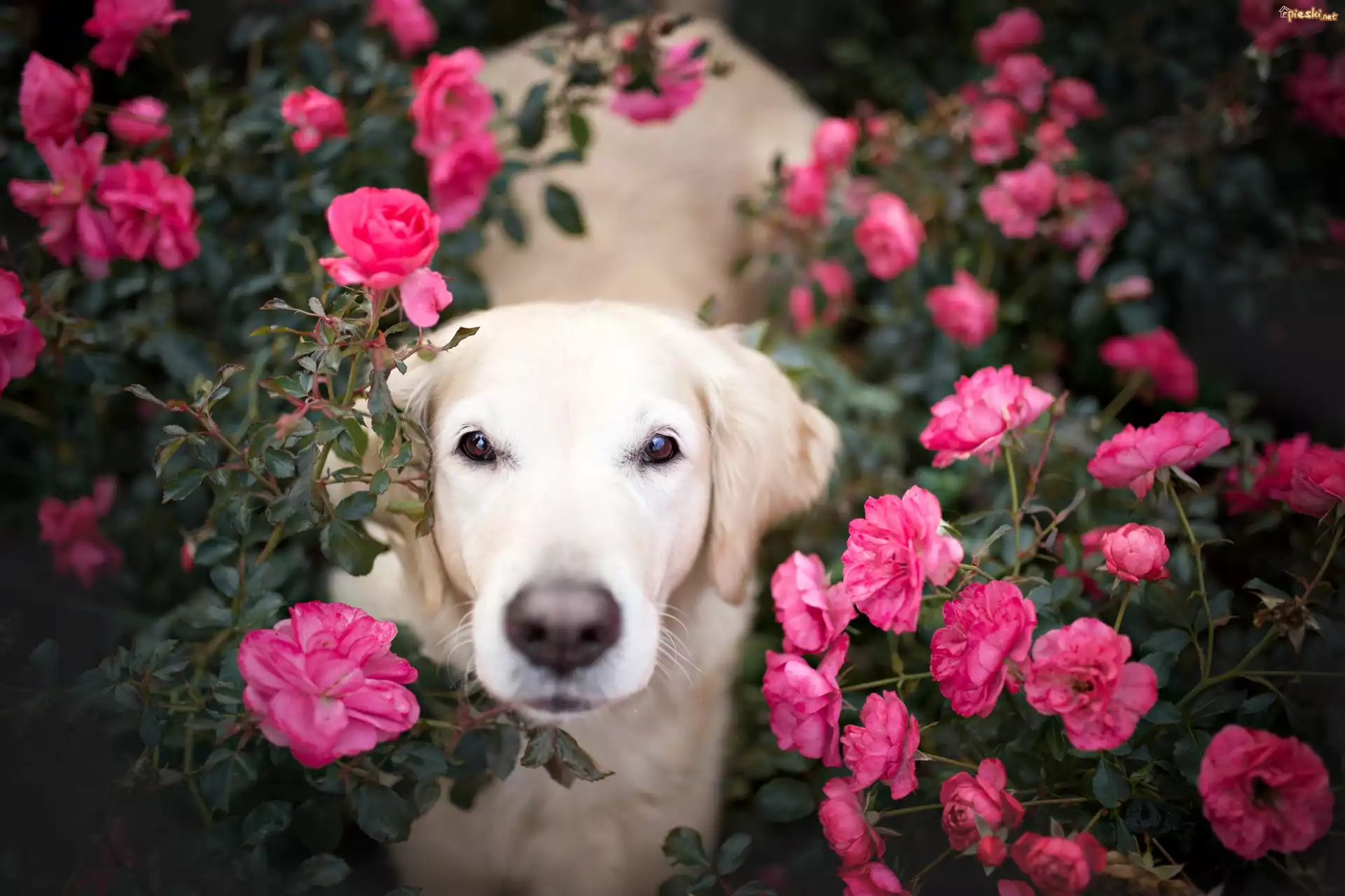 Pies Pies, Golden retriever, Kwiaty, Róże