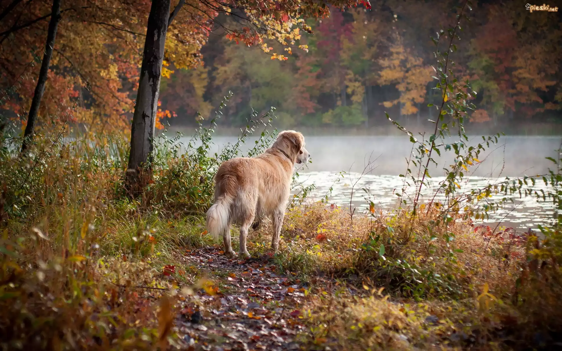Pies Pies, Rzeka, Las, Jesień, Golden Retriever