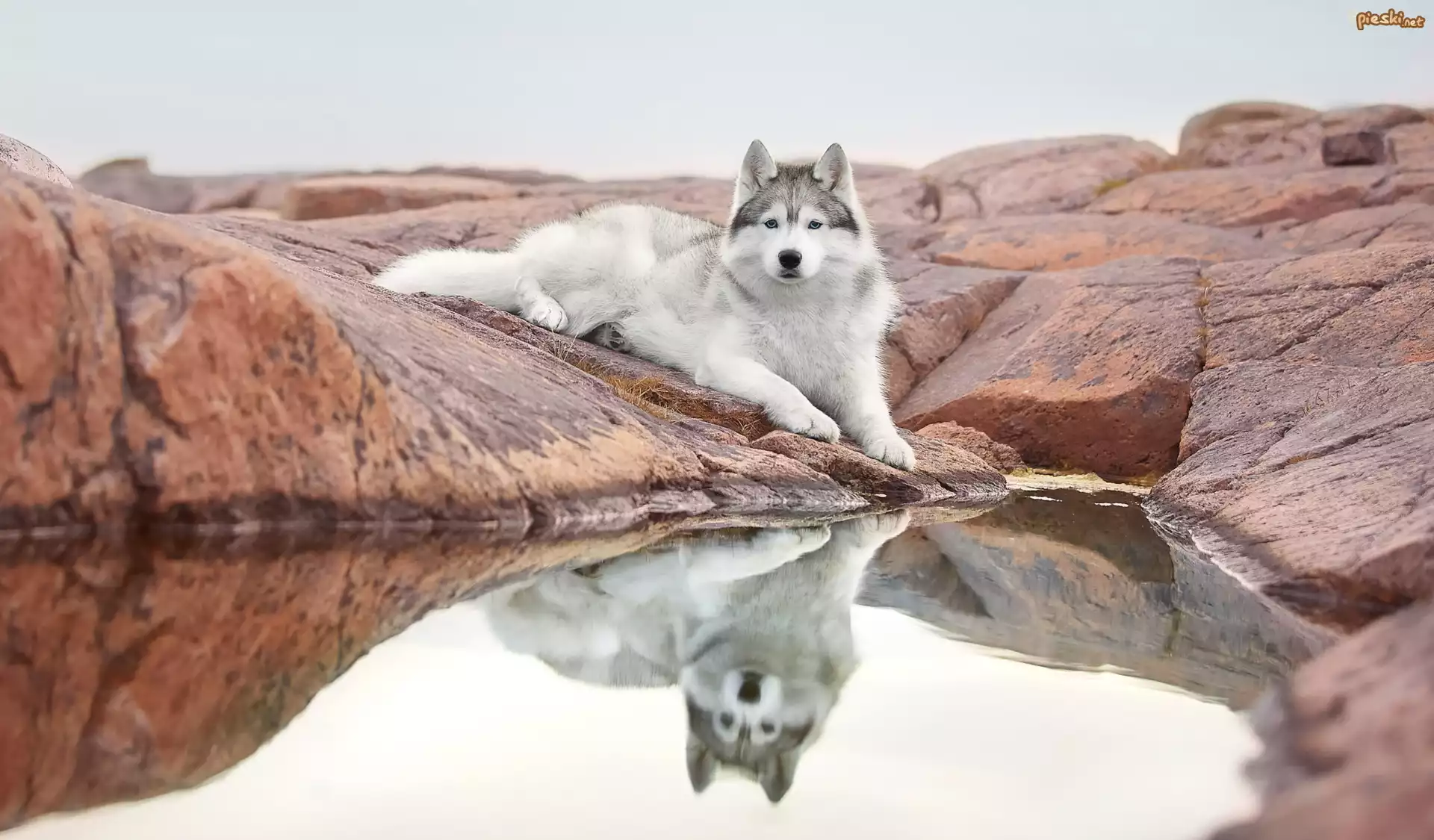 Pies Leżący, Pies, Siberian husky, Skała, Woda, Odbicie