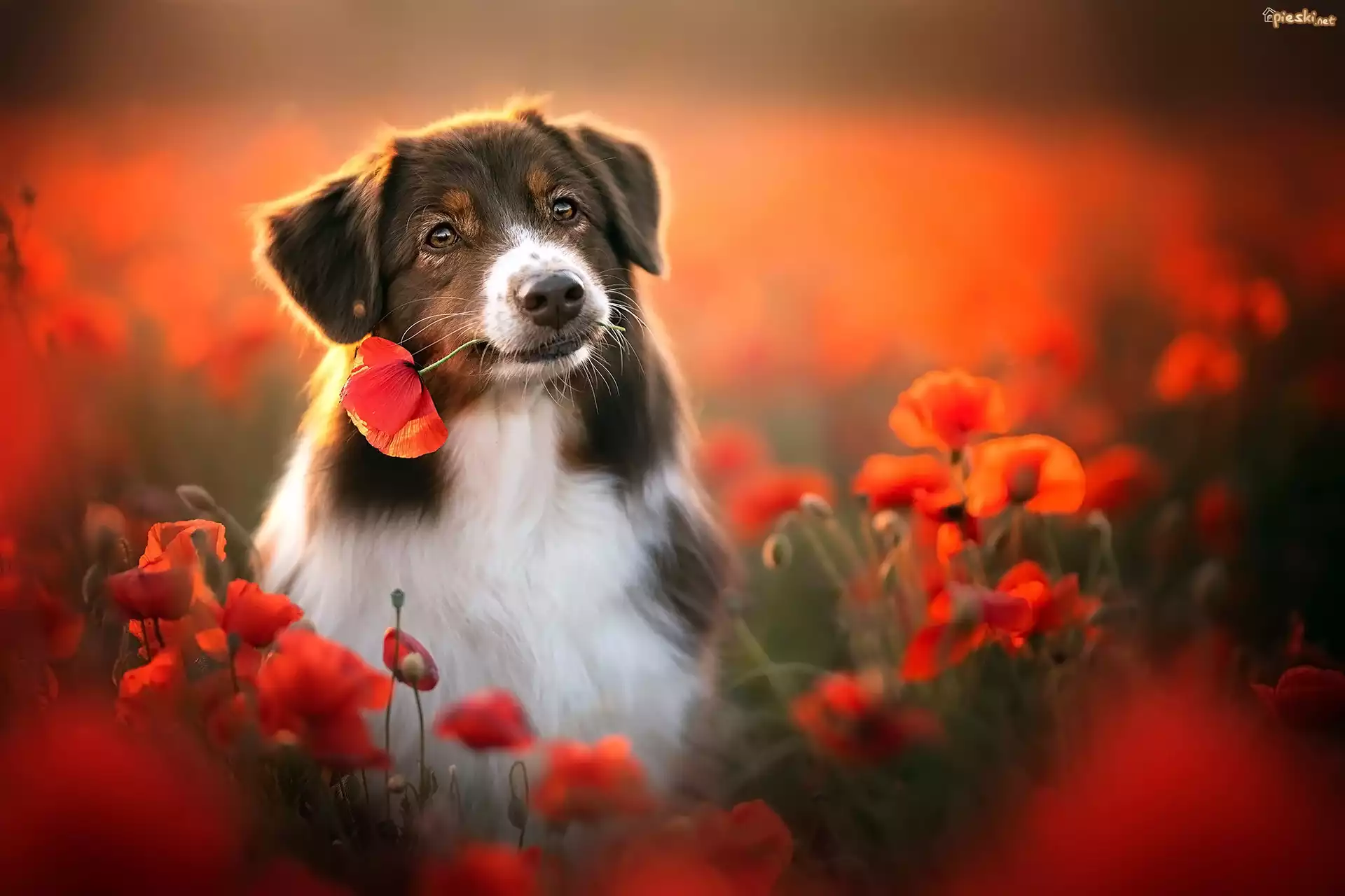 Pies Pies, Owczarek australijski, Kwiaty, Maki, Rozmycie