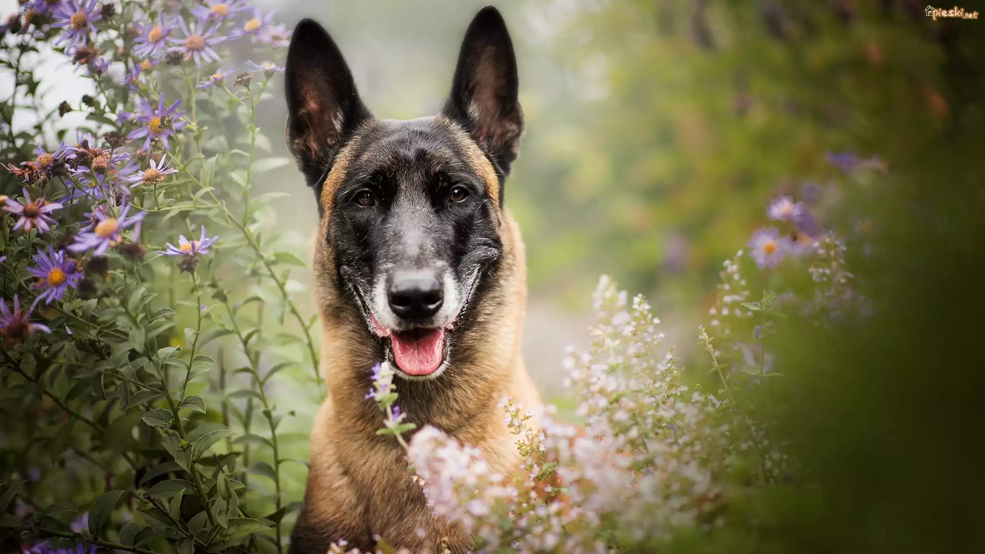 Pies Pies, Mordka, Owczarek belgijski Malinois, Kwiaty
