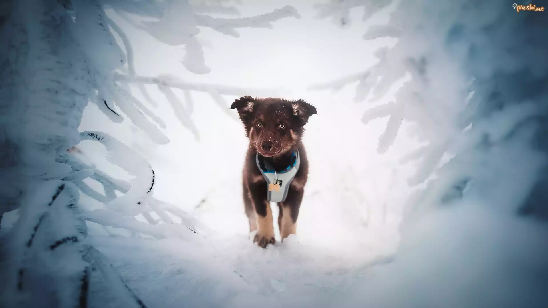 Pies Pies, Szczeniak, Szelki, Ośnieżone, Gałązki
