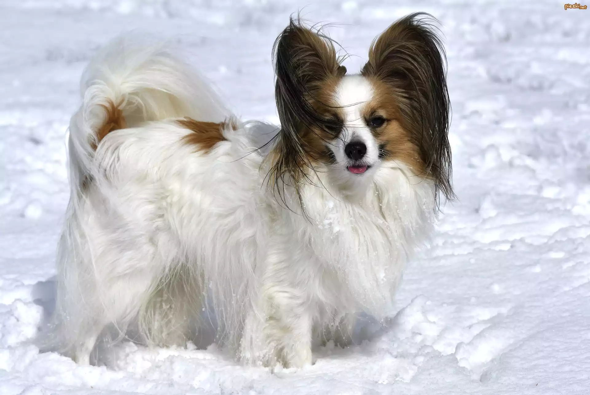 Pies Pies, Spaniel kontynentalny miniaturowy Papillon, Śnieg
