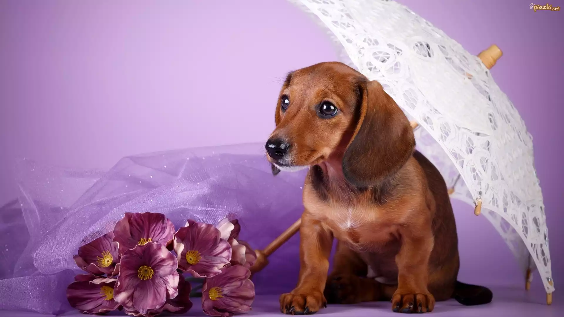 Pies Pies, Jamnik krótkowłosy, Parasolka, Kwiaty