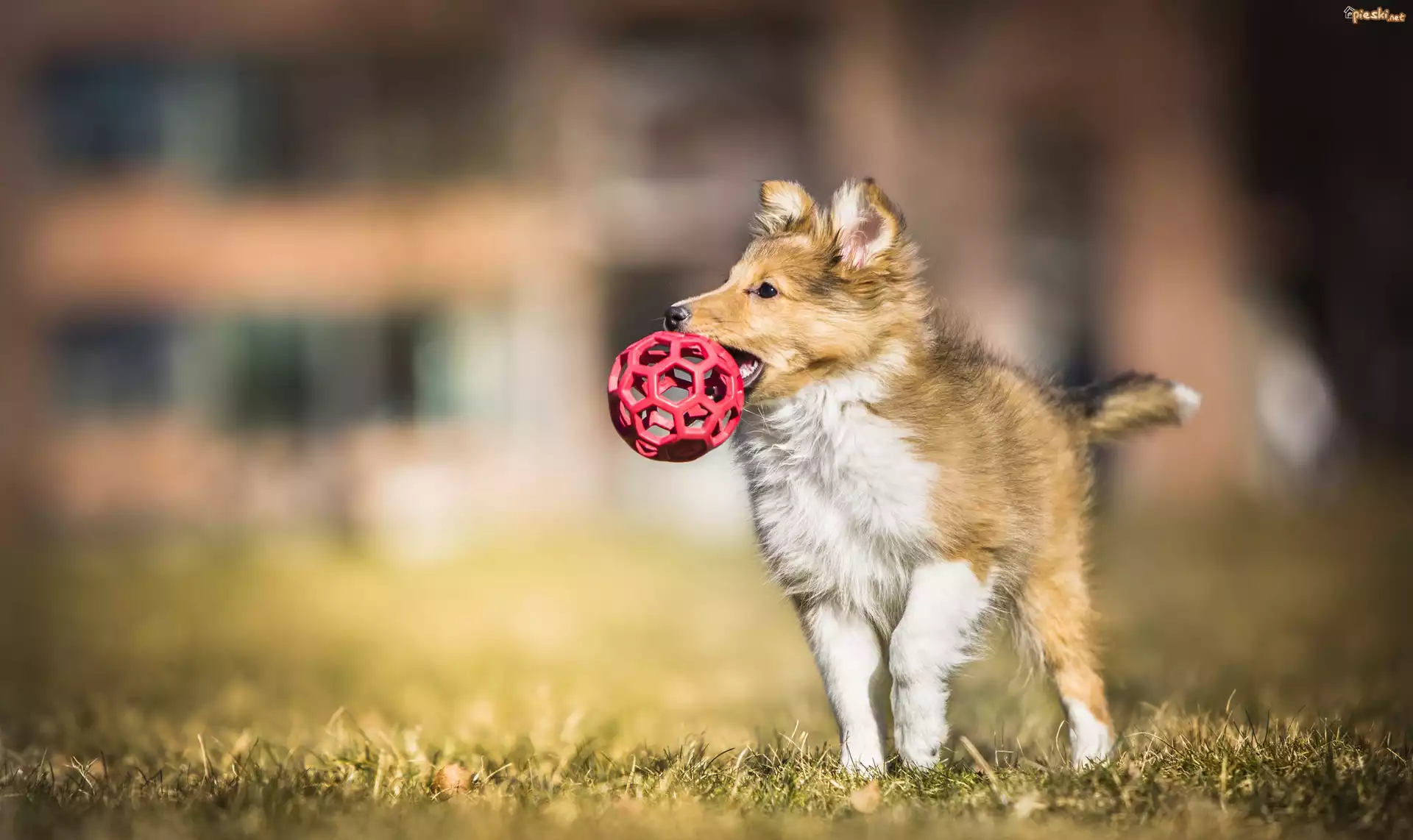 Pies Pies, Szczeniak, Owczarek szetlandzki, Piłeczka, Trawa