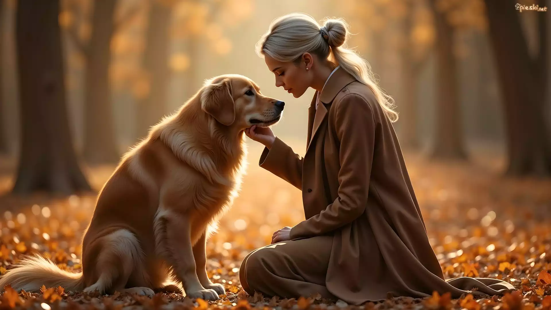 Pies Kobieta, Blondynka, Płaszcz, Pies, Golden retriever, Jesień
